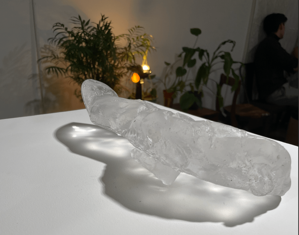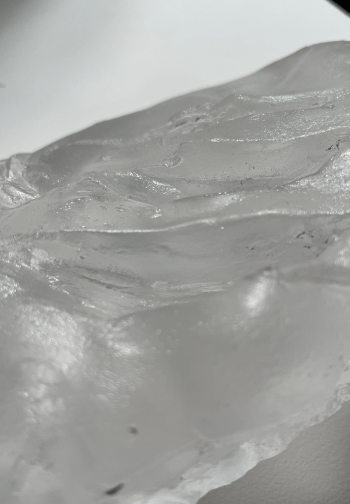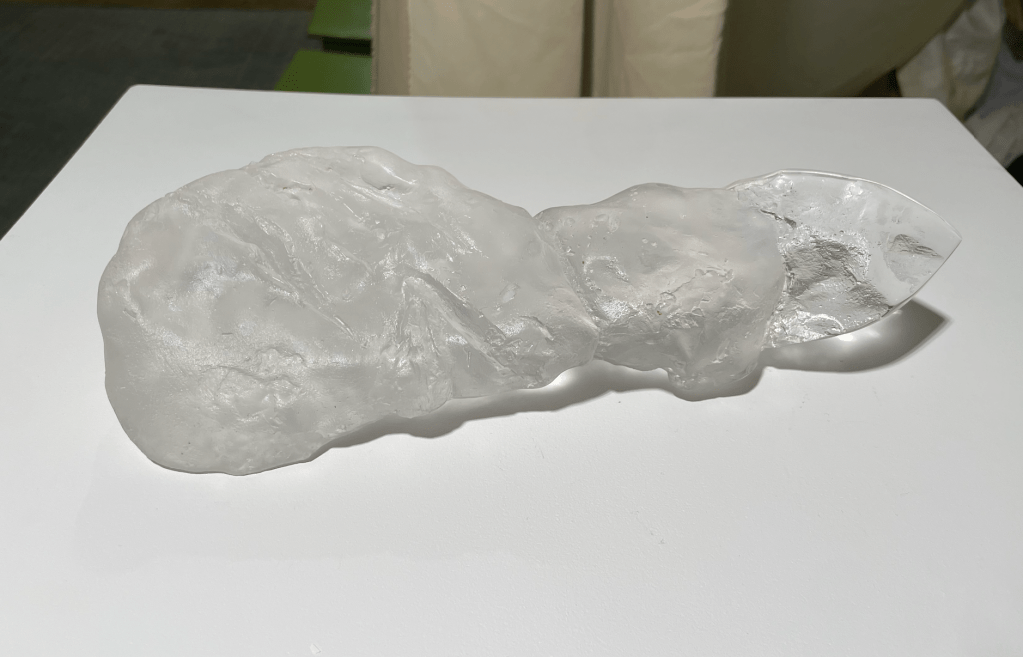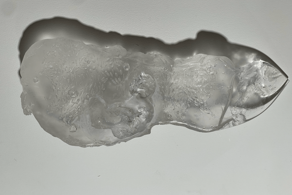 For this piece, featured in the Of What Remains Exhibition in March 2024, I drew inspiration from the ancient Greek myth of Prometheus, who stole fire from the gods of Olympus to give to his human creations. Prometheus had immense love and joy from humans, so he wanted to improve their lives. Unfortunately, Zeus, the king of the gods, becomes enraged at Prometheus when he finds out and curses Prometheus to be chained to a rock for eternity. Not only that, but an eagle would come down every day and tear out his liver, and it would regrow each night to continue this vicious cycle. This piece is quite literally Prometheus’s Liver, talon marks and all. The front side is jagged, like torn flesh in some areas, but polished in others. A small fetal figure emerges on the back side, sitting among etched swirls and flames. The piece is a lost wax kiln-formed glass piece made to be touched and held to the light. Disembowelment is a visceral and tactile experience, so carrying a three-pound human-scale glass liver and running one’s fingers along the cuts makes this act come more to life for the viewer.