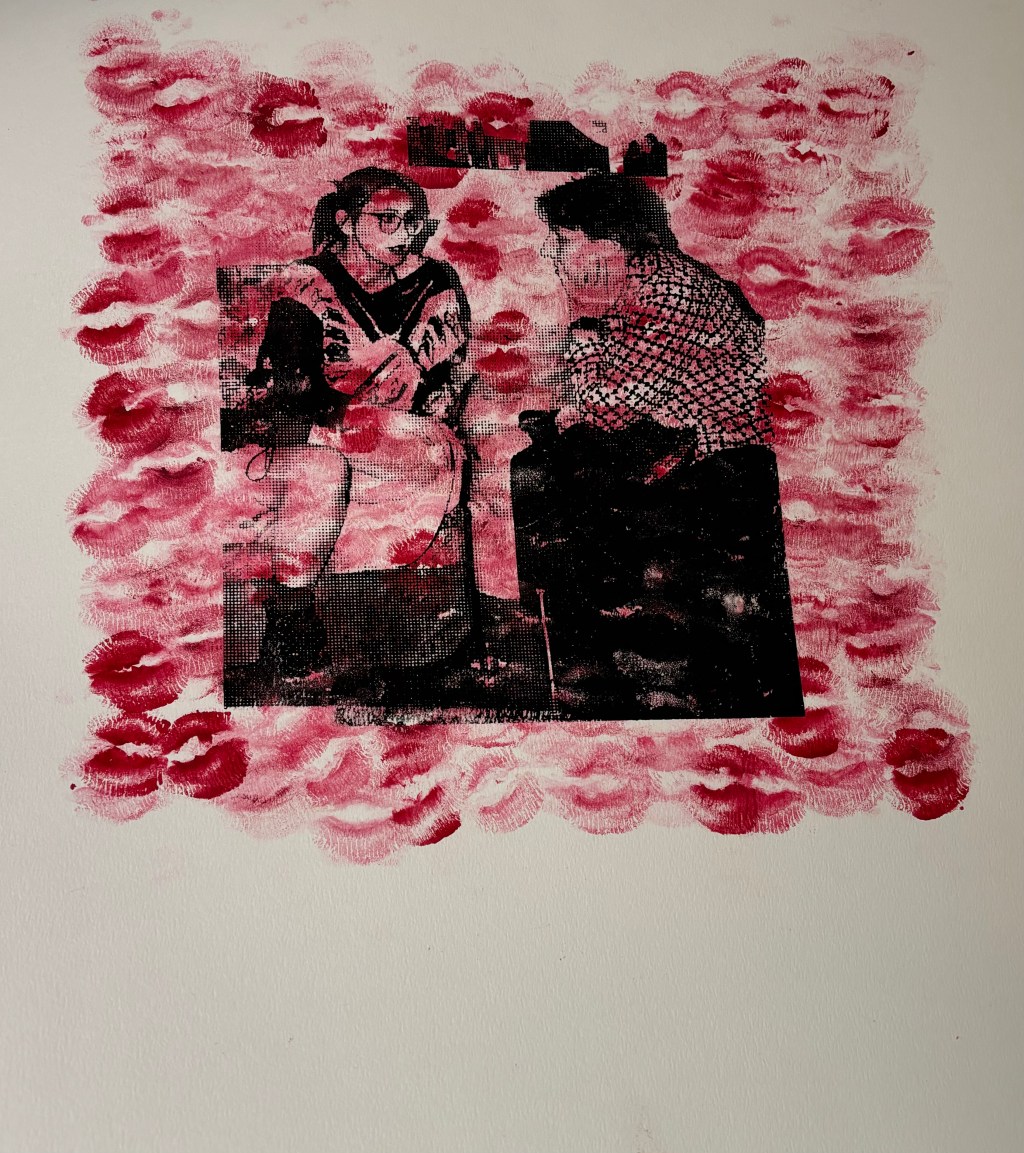 This piece is my final project for my screenprinting class. The background is lipstick kisses that I pressed onto the paper with my lips. I come from a long lineage of red lipstick wearers, and whenever my mom kisses me, she leaves a big lipstick stain on my cheek. I replicated this on the paper to honor her and to reflect on how many kisses she has given me throughout her lifetime. The process of kissing the paper was messy, and I smudged lipstick all over my face and the paper. The actual screenprint photo is of my mother and me during one of my first public art exhibitions in 2024, while my mom and I discussed how nervous I was to talk about my work in front of so many people.